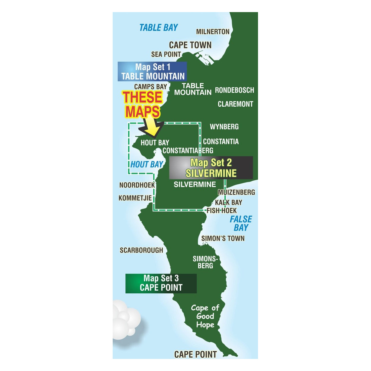 Silvermine & Hout Bay Map, Edition 6 covers the Silvermine Reserve one one side, stretching from Constantiaberg to Tokai, Zandvlei, Kalk Bay, the Fish Hoek Valley, Ou Kaapseweg, and Noordhoek/Chapman’s Peak. On side two the map highlights Hout Bay, Karbonkelberg, Llandudno, Constantia Nek, and extends south to the Silvermine Reservoir. Now also introducing detailed routes for mountain bikers.