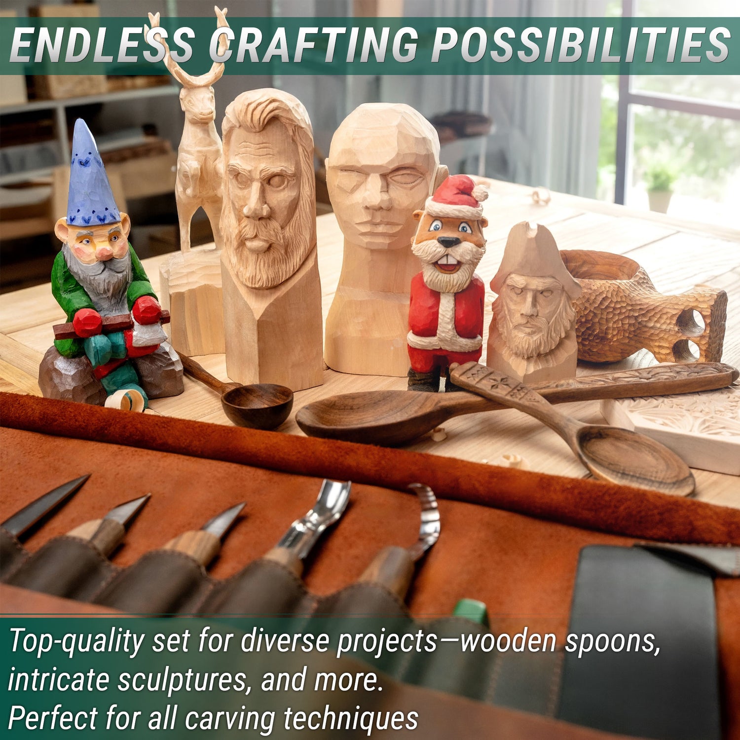 A complete, handcrafted wood carving set with 9 professional-grade tools and a genuine leather roll - built for serious makers and creative souls.