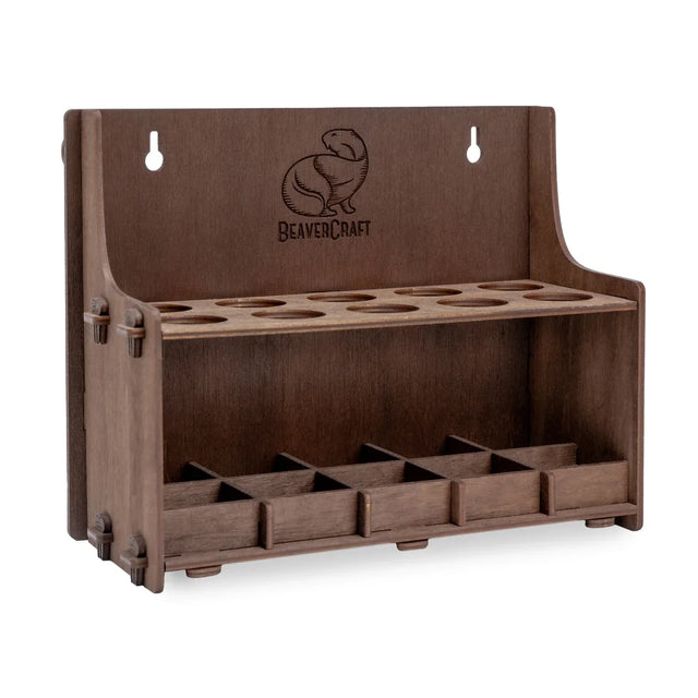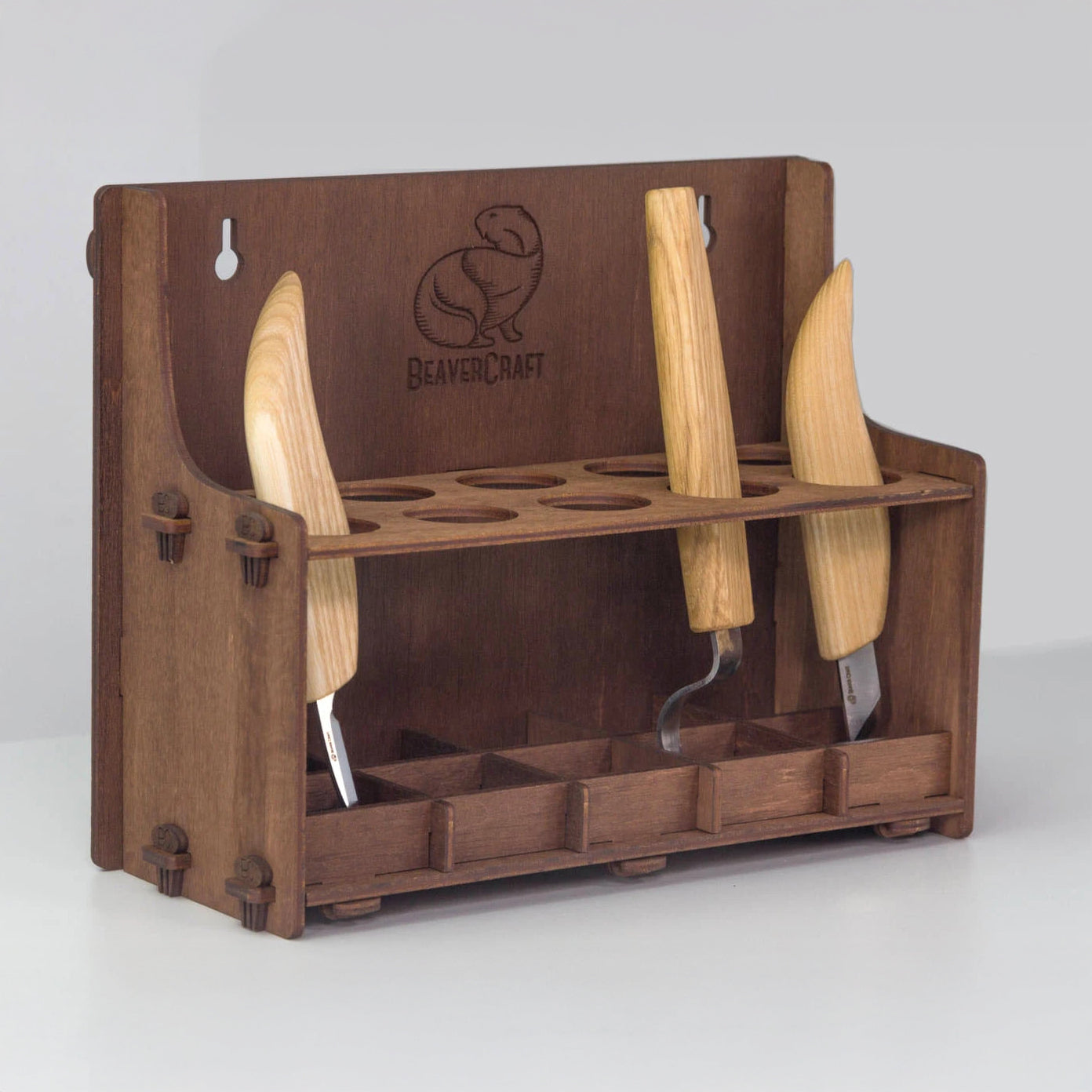 A smart, compact wooden tool holder with blade-safe storage for up to 10 carving tools.