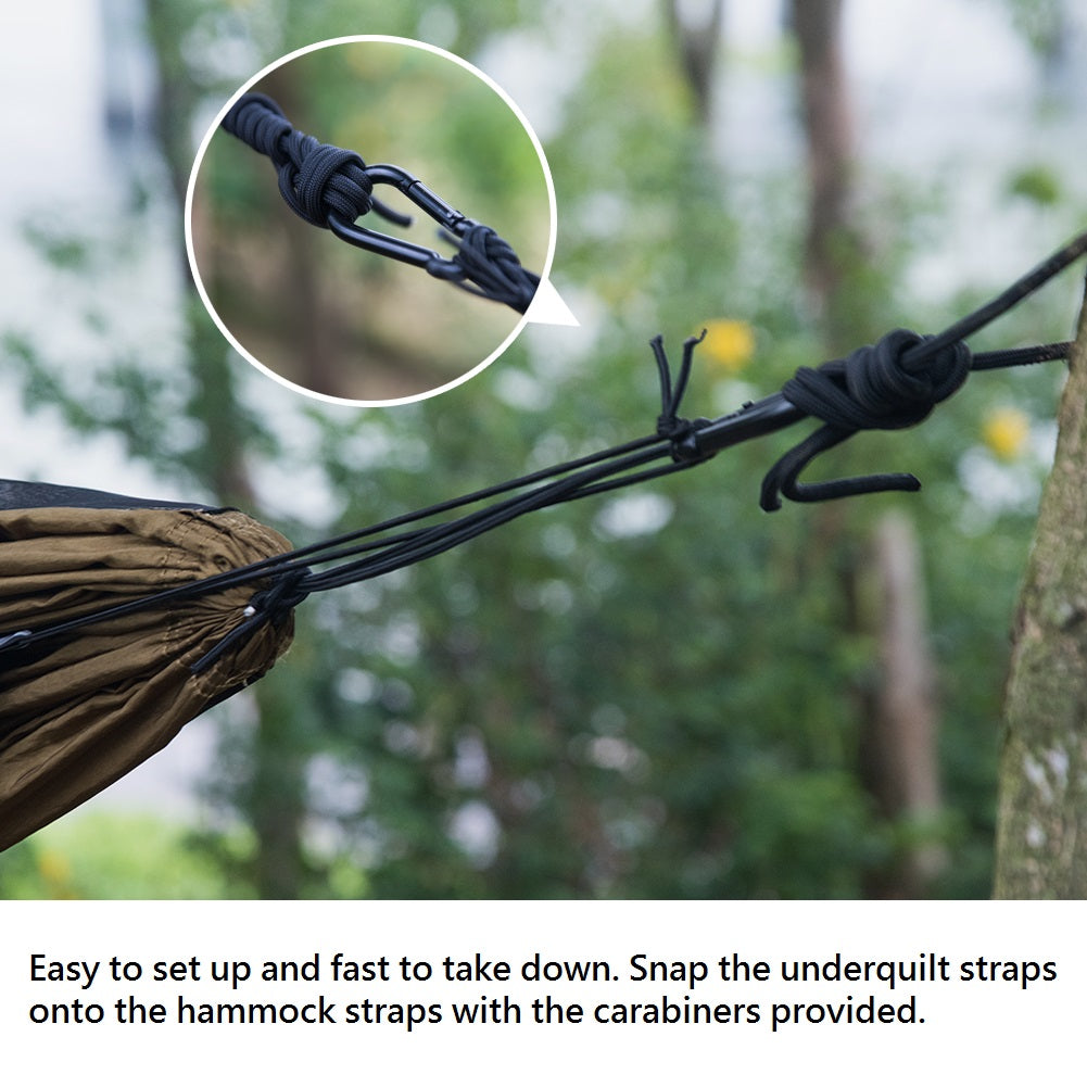 With SEE polyester insulation, a heat-reflective lining, and a windproof ripstop nylon outer shell, it keeps warmth where it belongs - close to you. Adjustable bungee cord loops make for a quick, snug fit around any standard single hammock. At just 800g, it’s easy to pack and even easier to love once the night gets cold.