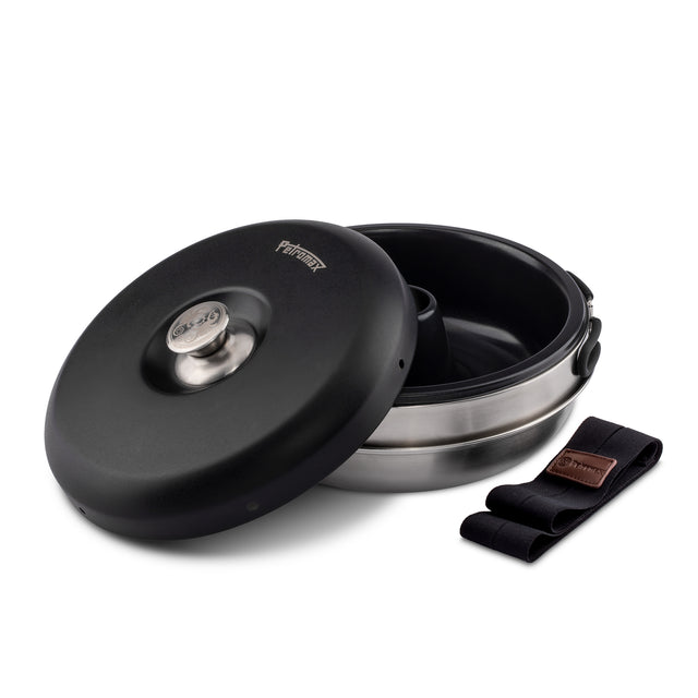 The Petromax Dimego Camping Oven turns your gas stove into a full-fledged oven, allowing you to bake and roast anywhere in the wild. This three-part system includes a base, a coated ring dish with handles, and a lid with ventilation openings, all designed to maximise heat distribution. Its standout feature is triple-direction heating: from the bottom, sides, and top, ensuring food is cooked evenly throughout with no cold spots.