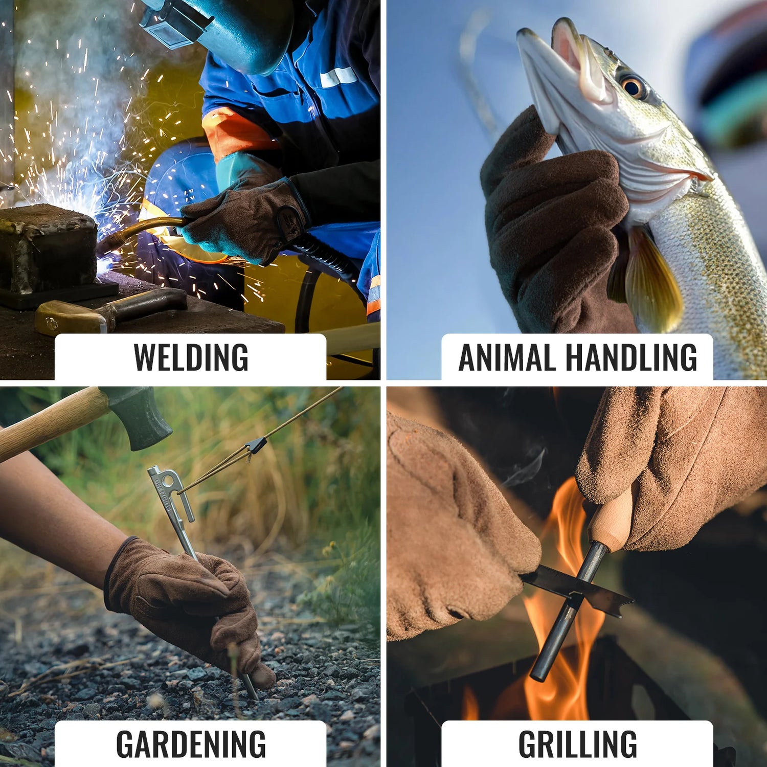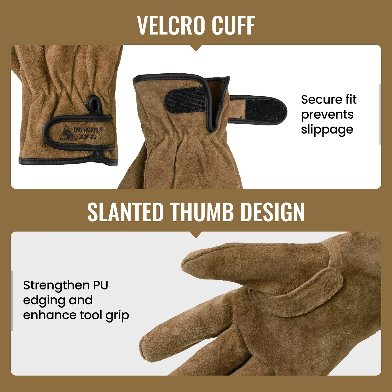 The OneTigris Leather Work Gloves are purpose-built for high-heat, hands-on work, whether you're forging steel, welding iron or cooking over open flame. Made from premium A-Grade cowhide leather with a fireproof treatment, these gloves are heat resistant up to 200°C, offering protection without compromising dexterity. The interior is lined with soft cotton for comfort and breathability, even during extended wear. With slanted thumbs and ergonomic stitching, they’re designed for a natural grip, letting you maintain control whether you’re holding tongs or lifting a pan from a fire. A Velcro cuff ensures a snug fit that won’t slip during intense tasks.